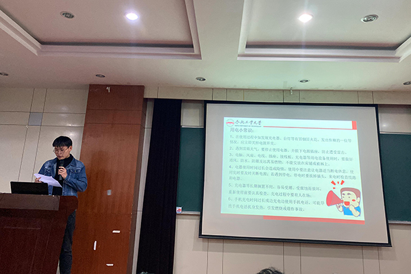 在安全宣传视频介绍的一幕幕真实案例面前,同学们更加深刻体会到了安全用电的重要性。宣讲会主持人陈伟伦同学结合视频向大家详细介绍了宿舍安全用电的注意事项,并分析了出现用电安全事故的主要原因。他强调,学生宿舍禁止使用一切大功率及发热电器,做到人走断电,宿舍安全无小事,平安生活靠大家。
